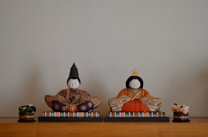 今年も ひな人形を出しました。 京都風の木目込み人形は ほっくりした雰囲気。 こちらのおひな様は檜扇を開かずに閉じていて、少数派かもしれません。 比べてみるのも楽しいですね。 ひな飾りには桜橘(さくらたちばな)が欠かせませんが、 「右近の橘」「左近の桜」といって御所の紫宸殿と同じ配置とのこと。