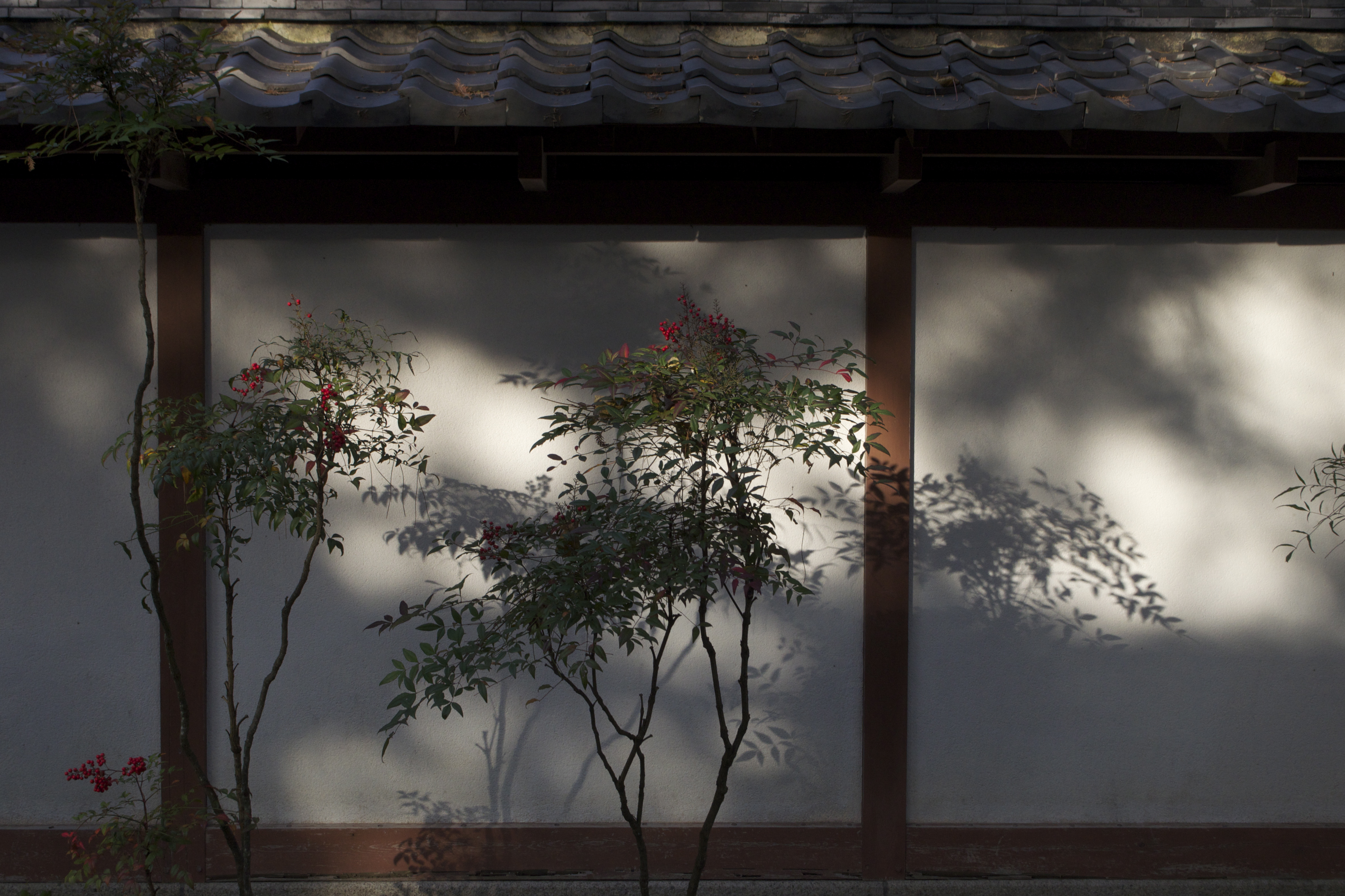 大仏さまで有名な高徳院。(12月7日) 漆喰壁の白に映えるナンテンの赤い実。西陽と風が壁に映す影。 束の間であろう光に吸い寄せられました。