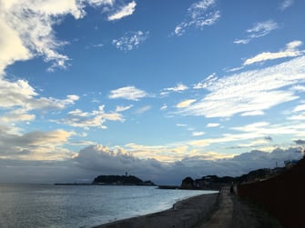 ほんのりと夕焼け色に染まる夏雲と江ノ島でした。