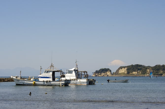 砂浜に出てから、さらに東の方(逗子方面)へ進んで行くと、晴れた時には西の方(稲村ガ崎の方向)に富士山を見ることができます。