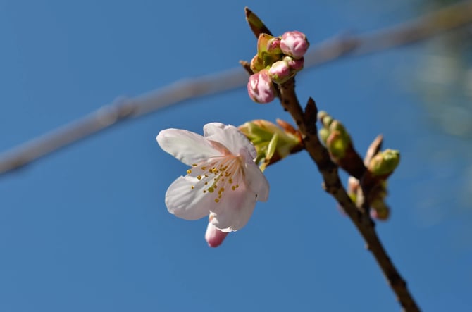 鶴岡八幡宮の参道、若宮大路沿いの玉縄桜(タマナワザクラ)は、段葛のソメイヨシノよりも一足先に次々と開花しています。
