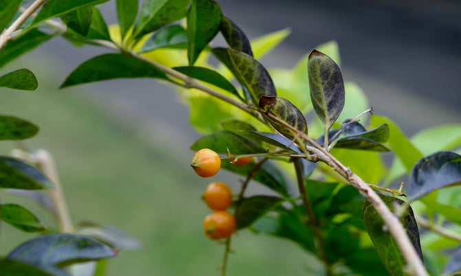 黄色い実はデュランタ、別名タイワンレンギョウ。