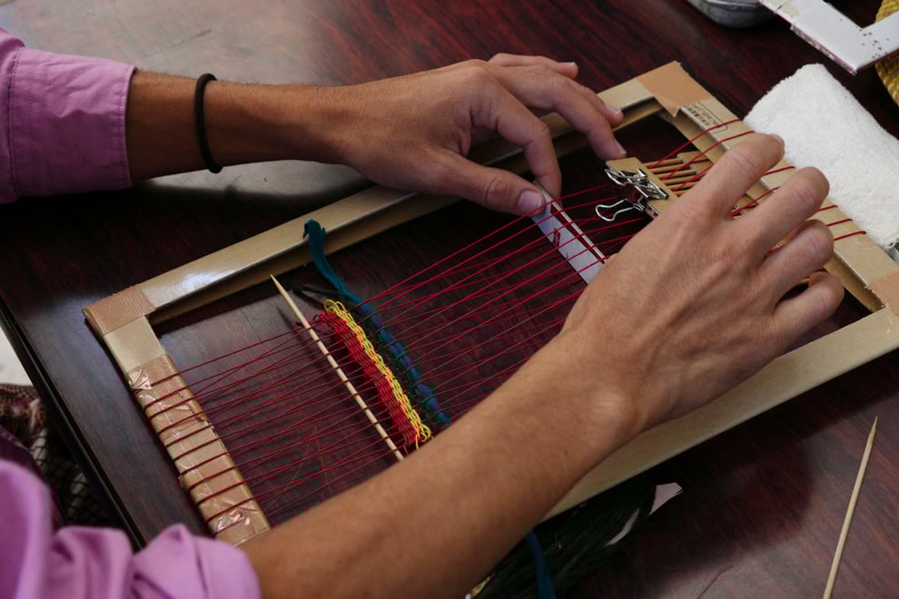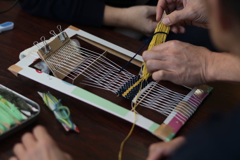 沖縄では定番の「贈答用のお米を入れる箱」を用いて、岩本大輔さんによって開発された「米箱機織りキット」を使った体験の風景。