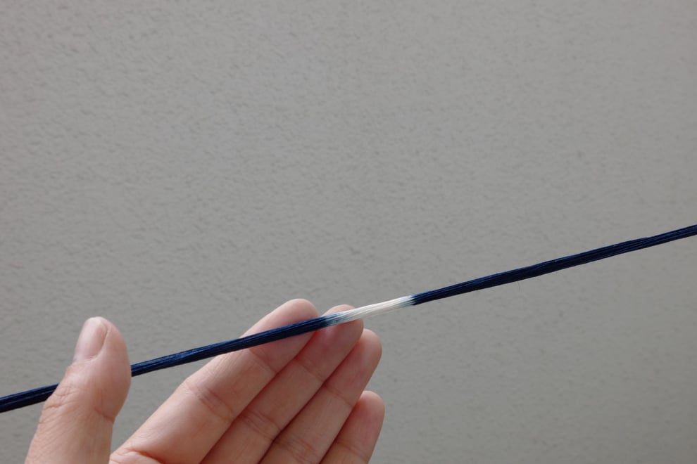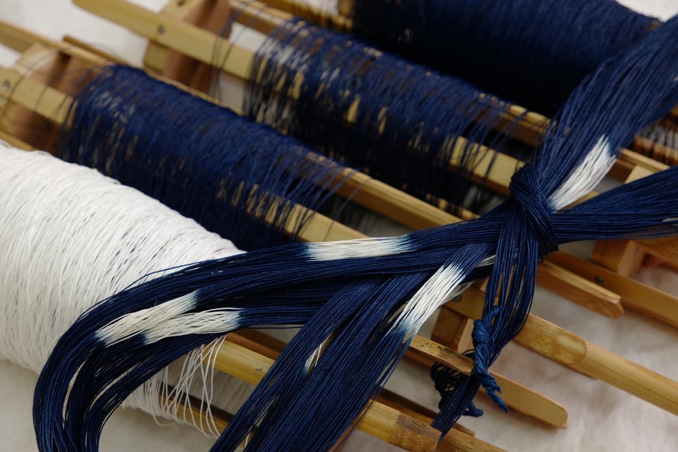 実際の宮古上布には手績(う)みの苧麻(ちょま)糸を用いますが、手績み糸は大変貴重なので、今回は機械紡績の苧麻糸(ラミー)や綿糸を用いて、藍染めしてご用意しました。