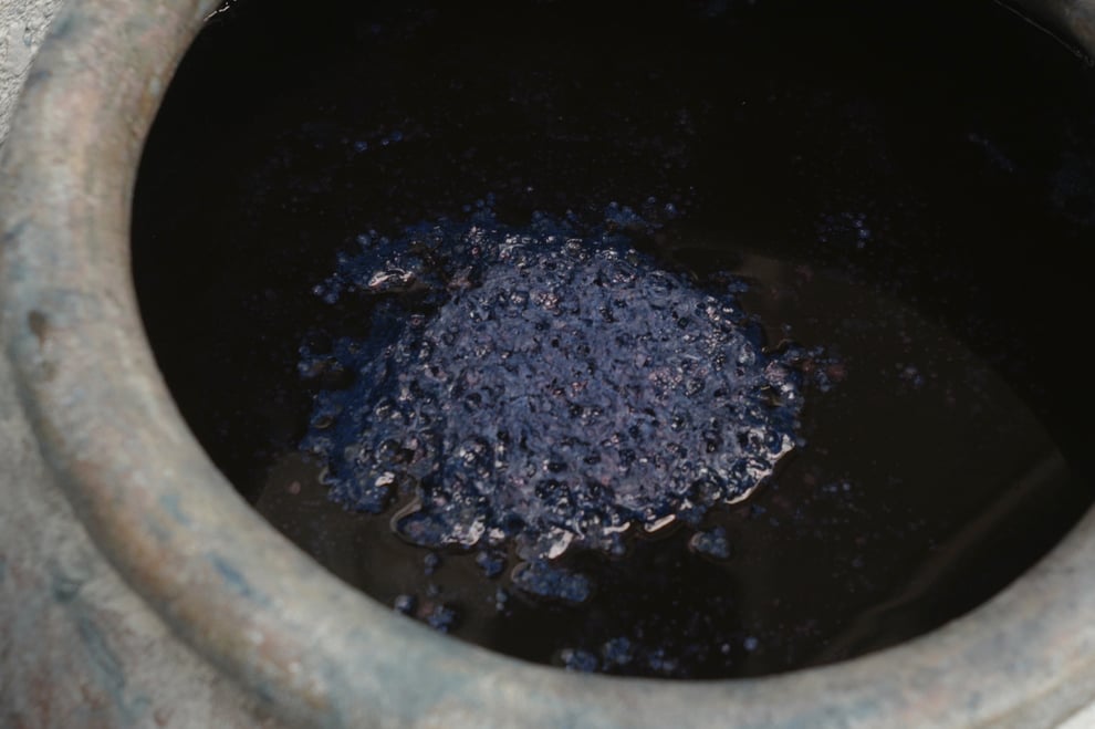 収穫2日後、「綺麗な色が出るからね」と、お声がけいただき、泥藍(沈殿藍)づくりのお手伝いをしました。
