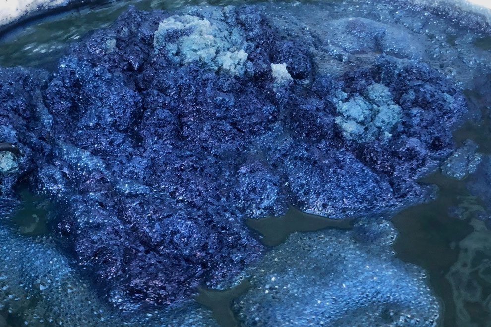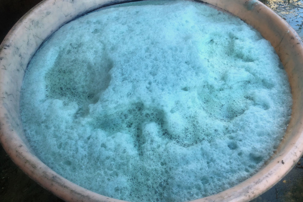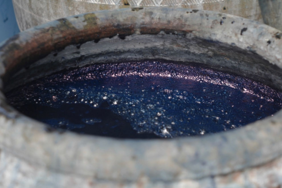 収穫2日後、「綺麗な色が出るからね」と、お声がけいただき、泥藍(沈殿藍)づくりのお手伝いをしました。