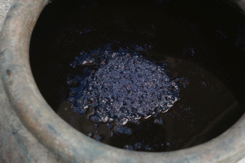 藍甕の中の液に浸し、あげたばかりの布は緑色。空気に触れて酸化が進むにつれて青色に変化します。(写真がないのが残念です…)